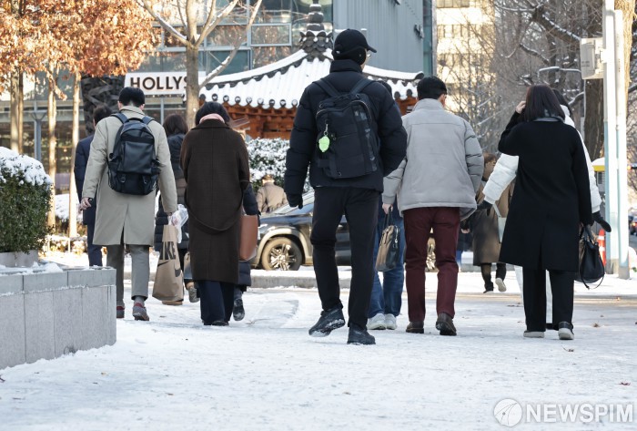 [서울=뉴스핌] 양윤모 기자 = 밤사이 내린 폭설과 한파로 도로 곳곳이 얼어붙은 5일 오전 서울 종로구 광화문에서 시민들이 출근을 하고 있다. 2025.12.05 yym58@newspim.com