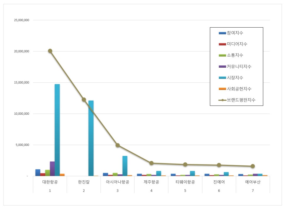 항공사 상장기업 브랜드평판 1위를 기록한 대한항공 브랜드는 참여지수 1,083,922 · 미디어지수 468,470 · 소통지수 1,013,042 · 커뮤니티지수 2,352,726 · 시장지수 14,766,336 · 사회공헌지수 400,823이 되면서 브랜드평판지수 20,085,319로 분석됐다. 지난 11월 브랜드평판지수 20,214,277과 비교하면 0.64% 하락했다.