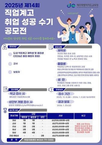 5일 제주도교육청은 고졸 취업 성공 문화 확산을 위해 '제14회 직업계고 취업 성공 수기 공모전'을 오는 8일부터 내년 1월 2일까지 진행한다고 밝혔다.