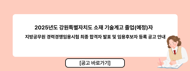 [스포츠서울ㅣ춘천=김기원기자]강원특별자치도교육청은 5일(금) 강원특별자치도 소재 기술계고 졸업(예정)자를 대상으로 실시한 지방공무원 경력경쟁임용시험 최종 합격자 22명의 명단을 발표했다.