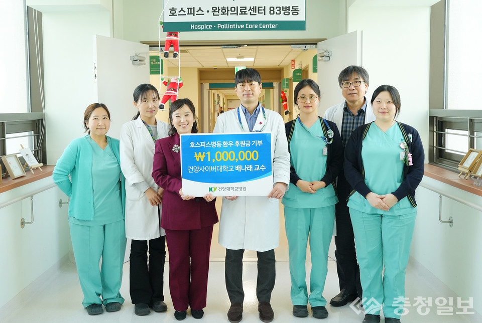 건양사이버대 사회복지학과 배나래 교수는 4일 정오, 건양대학교병원 호스피스완화의료센터를 찾아 후원금 100만원을 전달했다.