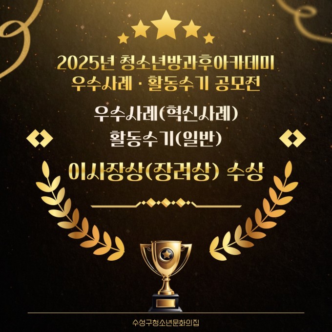 권위정 수성구청소년문화의집 관장은 "청소년들이 자신을 이해하고 또래와 건강한 관계를 맺도록 돕는 과정이 수상으로 이어져 매우 뜻깊다"며 "앞으로도 지역사회와 함께 지속 가능한 성장 지원 프로그램을 확대하겠다"고 말했다.