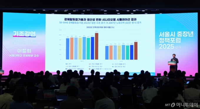 [서울=뉴시스] 최진석 기자 = 이철희 서울대학교 경제학부 교수가 23일 서울 중구 대한상공회의소 국제회의장에서 서울시 주최, 서울시50플러스재단 주관으로 열린 '서울시 중장년 정책포럼 2025'에서 인구변화의 노동시장 충격과 서울시의 중장년일자리 정책을 주제로 기조강연하고 있다. 2025.09.23. myjs@newsis.com /사진=최진석 |
