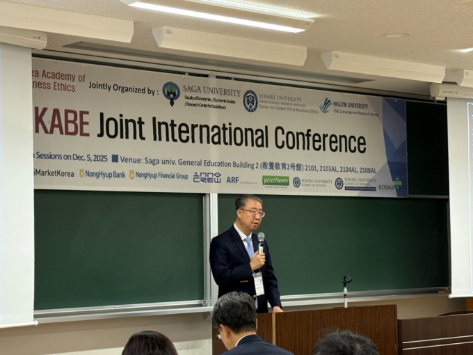 민순홍 한국윤리경영학회 학회장(연세대 경영대학 교수)가 5일 일본 사가현 사가시에 위치한 사가대학교에서 국제학술대회 개회사를 하고 있다./사진=김온유 기자 |