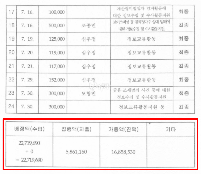 검찰이 특수활동비 자료에서 '수령자', '수령 사유'와 함께 먹칠로 감춘 내용 가운데 하나가 특수활동비의 월별 수입액과 지출액, 잔액을 정리한 '표'(이하 특수활동비 잔액표)다.