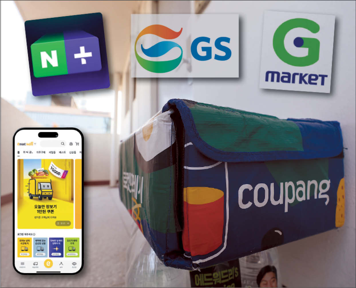 국내 이커머스 1위 업체 쿠팡에서 약 3400만건에 이르는 대규모 개인정보가 유출돼 논란이 커지고 있는 가운데 2일 서울 시내 한 아파트 복도에 쿠팡 로켓프레시 가방이 놓여 있다. 네이버플러스스토어, G마켓, SSG닷컴, GS리테일의 로고와 앱의 모습. [연합·각사 홈페이지] |