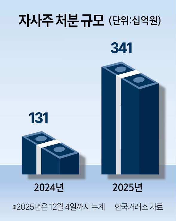 5일 한국거래소 등에 따르면 연초부터 4일까지 코스피 시장에서 누적된 자사주 처분 규모는 3410억원으로 집계됐다. 아직 12월이 전부 지나지 않았지만 이미 지난해 처분 규모 1310억원와 비교하면 2.6배가량 증가한 것이다.