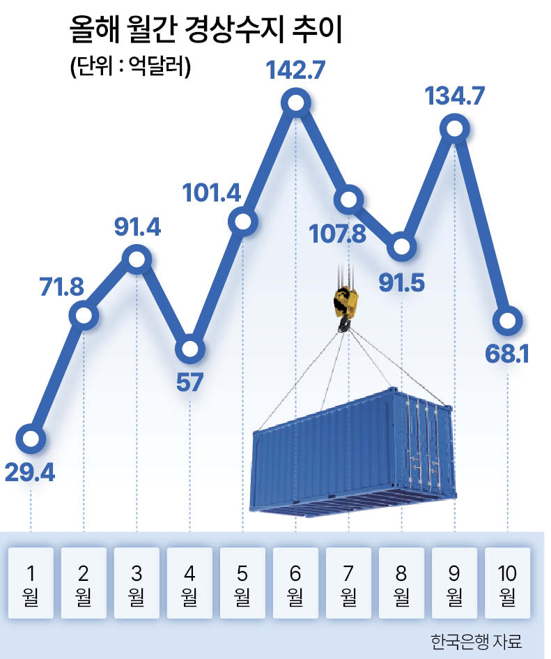 지난달 27일 한은은 올해 마지막 경제전망에서 올해 경상수지 흑자 규모 전망치를 기존 1100억 달러에서 1150억 달러로 50억 달러 더 높였다. 올해 10월까지 누적 경상수지가 895억8000만 달러인 점을 고려하면 남은 11월, 12월 두 달 동안 102억 달러 정도의 흑자만 내면 연간 목표치를 달성할 수 있는 셈이다.