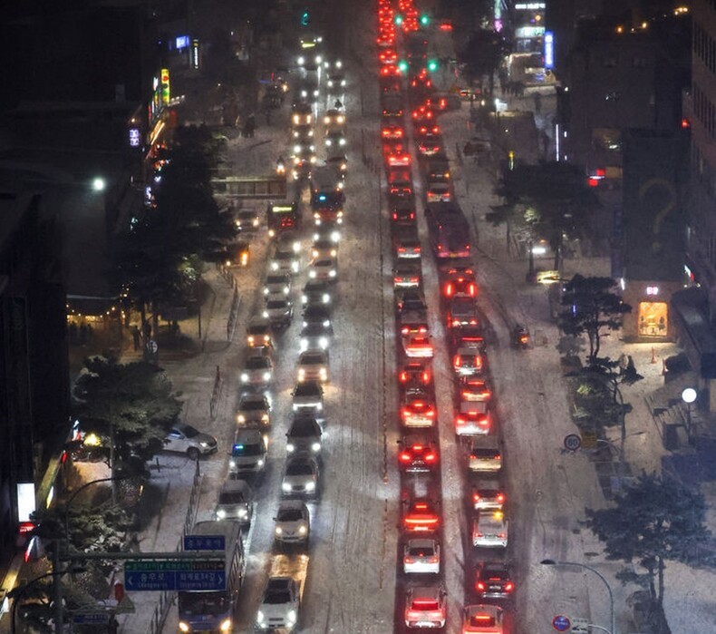 지난 4일, 수도권과 강원 일대에 대설주의보가 발효된 가운데 서울 중구 도심 도로에 교통 정체가 빚어지고 있다. ⓒ뉴시스 |