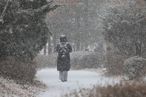 지난 4일 오후 서울 서초구의 한 거리에서 한 시민이 눈길을 걷고 있다. [연합] |
