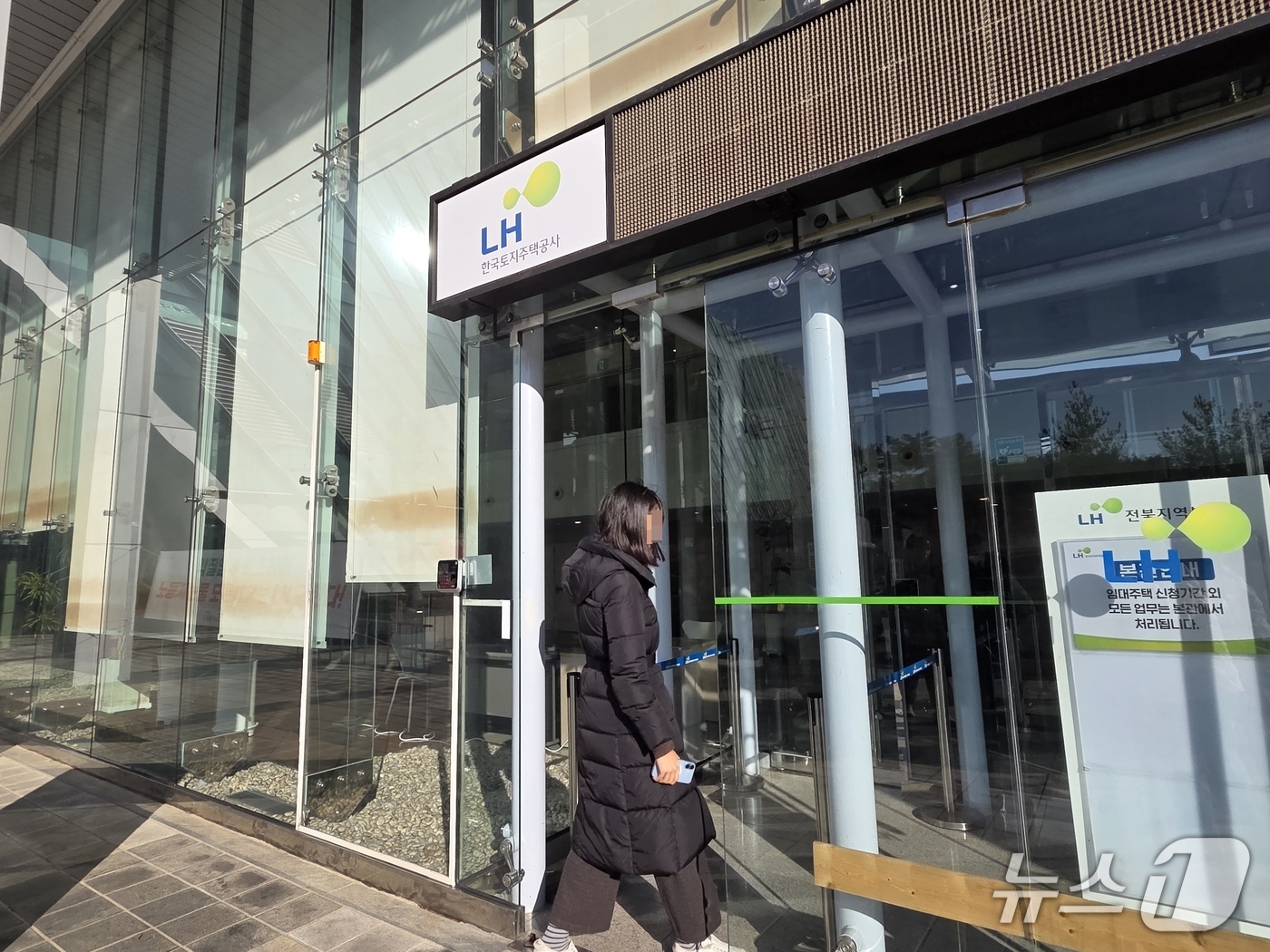 5일 오전 11시께 깨진 LH전북본부 출입문 사이로 한 시민이 지나가고 있다.2025.12.5/뉴스1 장수인 기자 |