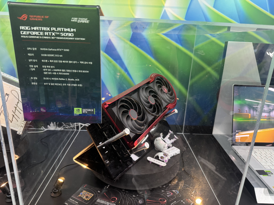 저번 10월 말에 있었던 '지포스 게이머 페스티벌'에서 이 녀석을 보고야 말았습니다. 네, 바로 그 젠슨 황 회장과 이재용 회장, 정의선 회장이 모였던 그 자리 말이죠. 파트너사들이 모여있는 ASUS 부스에 전시된 30주년 한정판 ROG Matrix Platinum RTX 5090입니다. ROG Astral RTX 5090도 멋졌지만, 30주년 한정판은 더더욱 멋졌습니다. 하지만, 이 제품이 영원히 제 손에 들어올 일은 없을 것 같습니다. 그냥 본 것으로 만족해야죠.