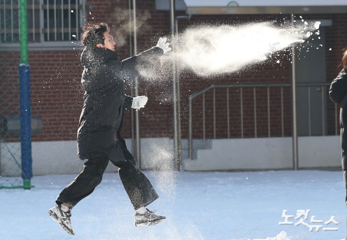 지난밤 내린 기습 폭설로 곳곳에 많은 눈이 쌓인 가운데 5일 서울 광진구 광남고등학교에서 학생들이 눈싸움을 하고 있다.