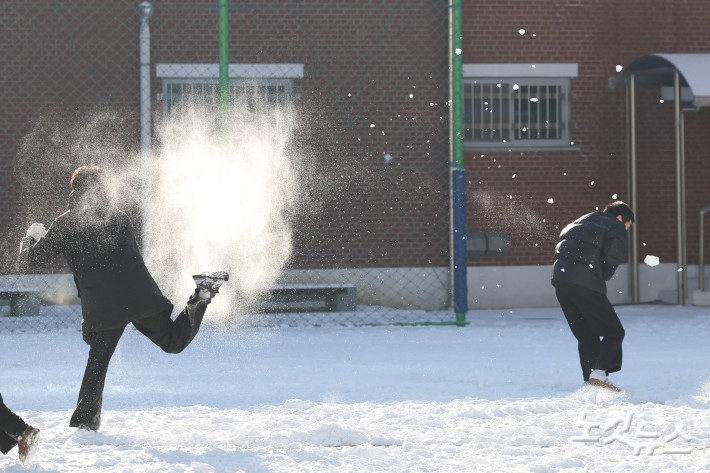지난밤 내린 기습 폭설로 곳곳에 많은 눈이 쌓인 가운데 5일 서울 광진구 광남고등학교에서 학생들이 눈싸움을 하고 있다.