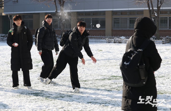 지난밤 내린 기습 폭설로 곳곳에 많은 눈이 쌓인 가운데 5일 서울 광진구 광남고등학교에서 학생들이 눈싸움을 하고 있다.