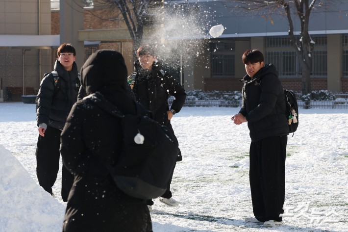 지난밤 내린 기습 폭설로 곳곳에 많은 눈이 쌓인 가운데 5일 서울 광진구 광남고등학교에서 학생들이 눈싸움을 하고 있다.