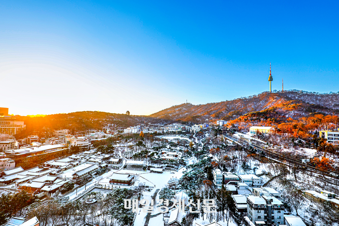 서울에 많은 첫 눈이 내린 다음 날인 5일 오전 매일경제사옥에서 바라본 남산골 한옥마을이 하얀 눈으로 덮여 있다. 2025.12.05[이충우기자]