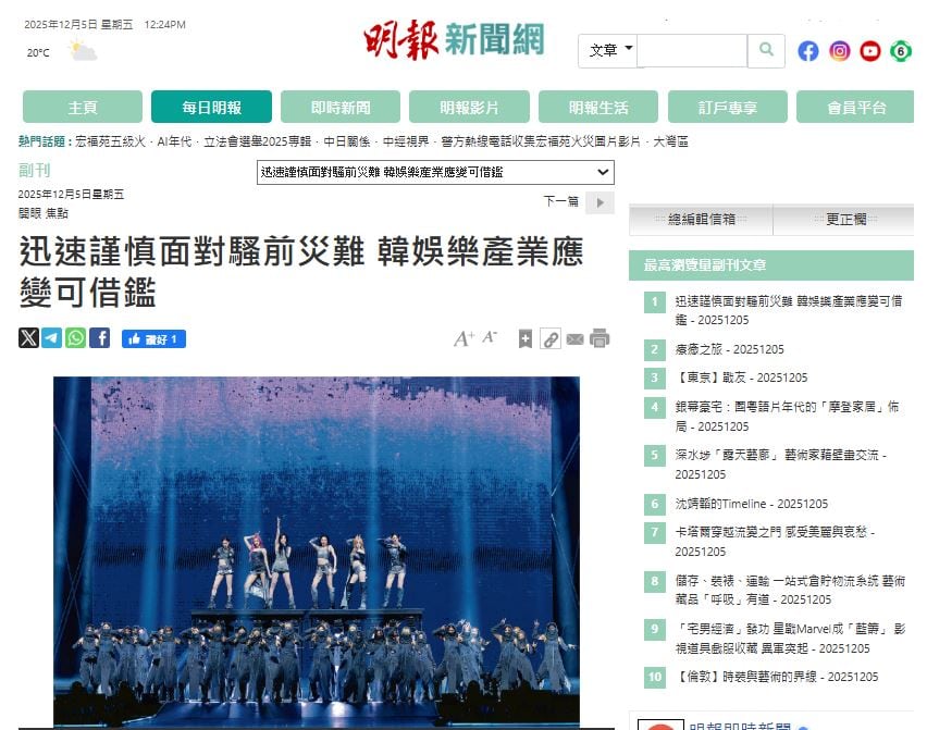 5일 홍콩 명보가 11월 28일 CJ ENM이 홍콩에서 개최한 ‘MAMA 2025’에서 보여준 위기 대응 메뉴얼을 조명했다./홍콩 명보 |