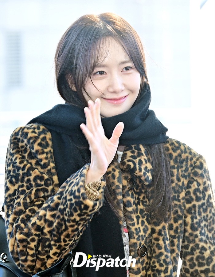 윤아는 호피 무늬 코트로 화려한 공항패션을 완성했다. 청순한 비주얼과 러블리한 미소도 돋보였다.