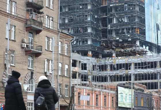 우크라이나 수도 키이우에 2023년 러시아의 미사일 공격을 받은 삼성전자 입주 건물이 파손된 채로 방치되어 있다. 연합뉴스 |