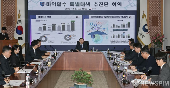 [서울=뉴스핌] 양윤모 기자 = 이명구 관세청장이 5일 오전 서울 강남구 논현동 서울세관에서 열린 '마약밀수 특별대책 추진단 회의'를 주재하고 있다. 관세청은 올해 1∼10월까지 국경단계서 적발된 마약 규모는 2천913㎏으로, 지난해 같은 기간의 4배로 급증하며 역대 최대치를 기록했으며,경로별로 항공 여행자가 1년 전보다 2배 넘은 505건으로 가장 많았다고 발표했다. 2025.12.05 yym58@newspim.com