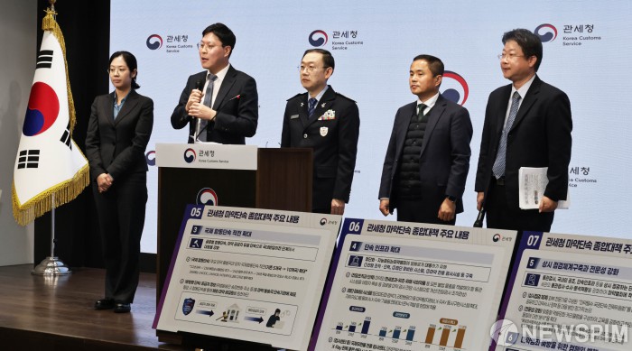 [서울=뉴스핌] 양윤모 기자 = 이명구 관세청장이 5일 오전 서울 강남구 논현동 서울세관에서 '마약 단속 국제공조 추진 현황 및 관세청 마약 단속 종합 대책'을 발표후 관계자들과 함께 질의응답에 참석하고 있다. 관세청은 올해 1∼10월까지 국경단계서 적발된 마약 규모는 2천913㎏으로, 지난해 같은 기간의 4배로 급증하며 역대 최대치를 기록했으며,경로별로 항공 여행자가 1년 전보다 2배 넘은 505건으로 가장 많았다고 발표했다. 2025.12.05 yym58@newspim.com