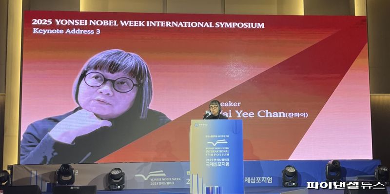 2025 연세노벨위크 국제심포지엄에서 기조강연 중인 찬와이.사진=홍채완 기자 |