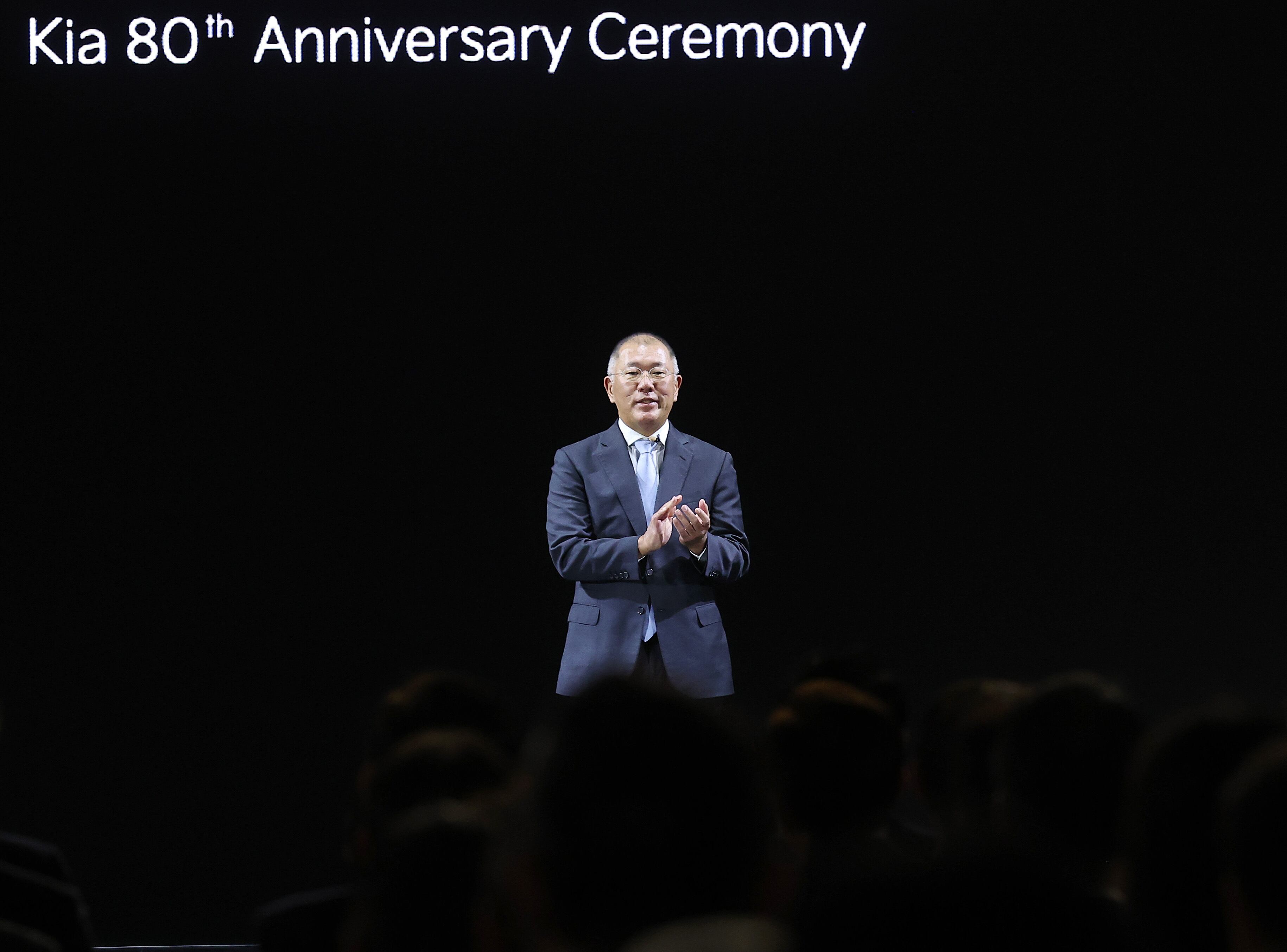 정의선 현대차그룹 회장이 5일 경기 용인시 기아 비전스퀘어에서 열린 기아 80주년 기념식에서 발언하고 있다./연합뉴스 |
