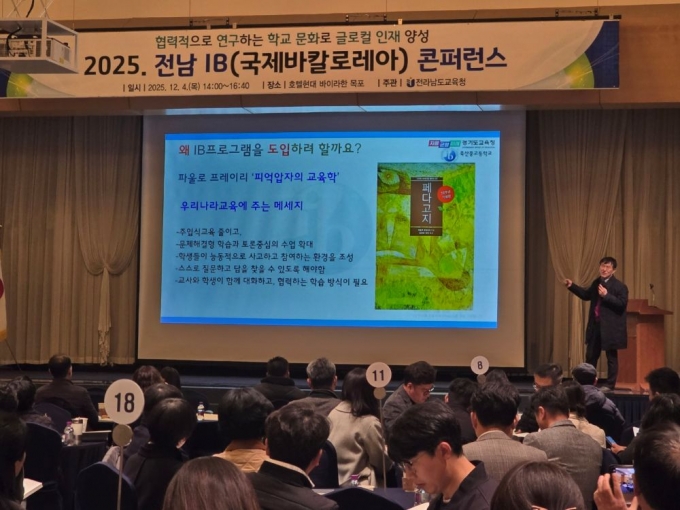 전남교육청은 지난 4일 영암군에서 '2025 전남 IB 콘퍼런스'를 개최했다. 행사에는 IB 운영학교, 연구회, 일반학교 교원 등 250여명이 참석해 IB 프로그램 운영 방향과 2026년 공모 계획을 함께 논의했다.