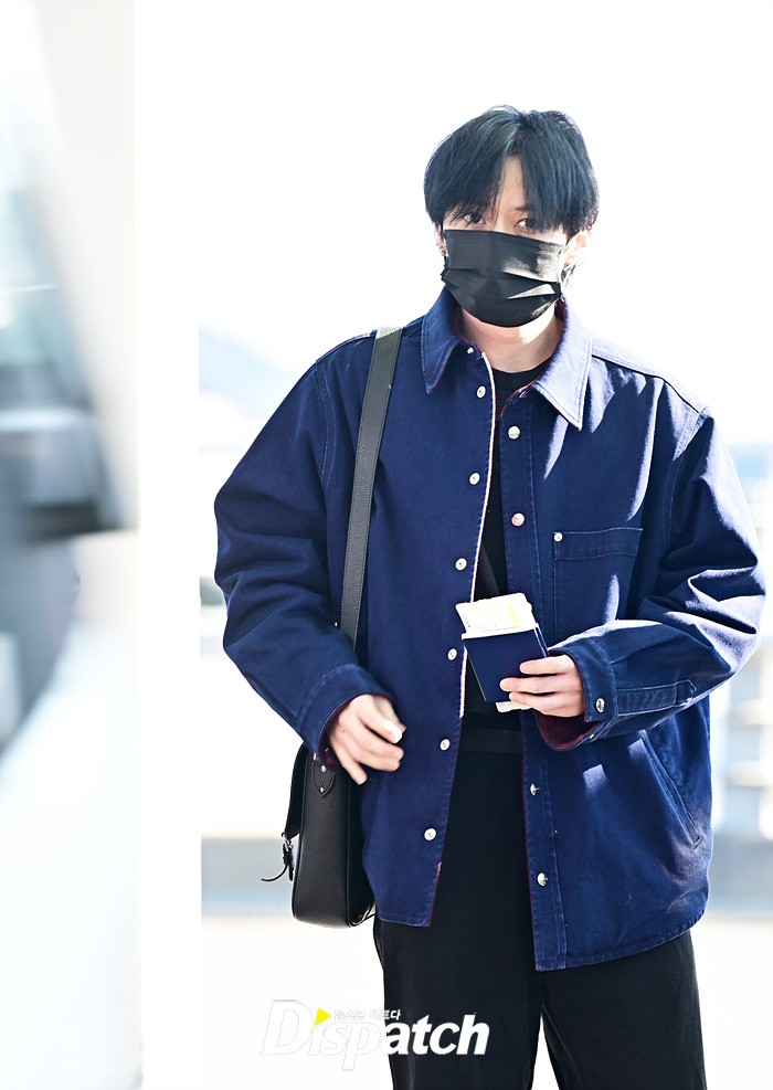 리노는 네이비 컬러의 데님 재킷과 카고 팬츠로 힙한 공항패션을 완성했다. 마스크에도 훈훈한 비주얼이 돋보였다.
