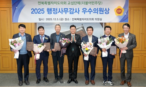 (전주=연합뉴스) 임채두 기자 = 전북특별자치도의회 더불어민주당 교섭단체는 5일 '2025 행정사무감사 우수의원상' 수상자 5명을 선정했다고 밝혔다.