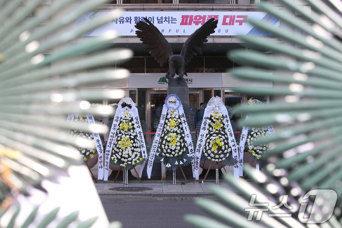 (대구=뉴스1) 공정식 기자 = 대구의 시민 프로축구단 대구FC 응원단(그라지예)과 축구팬들이 5일 오전 대구 중구 동인청사 앞에서 대구FC K리그2 강등에 대한 구단의 쇄신과 대책 마련 등을 요구하는 근조화환 시위를 벌이고 있다. 2025.12.5/뉴스1