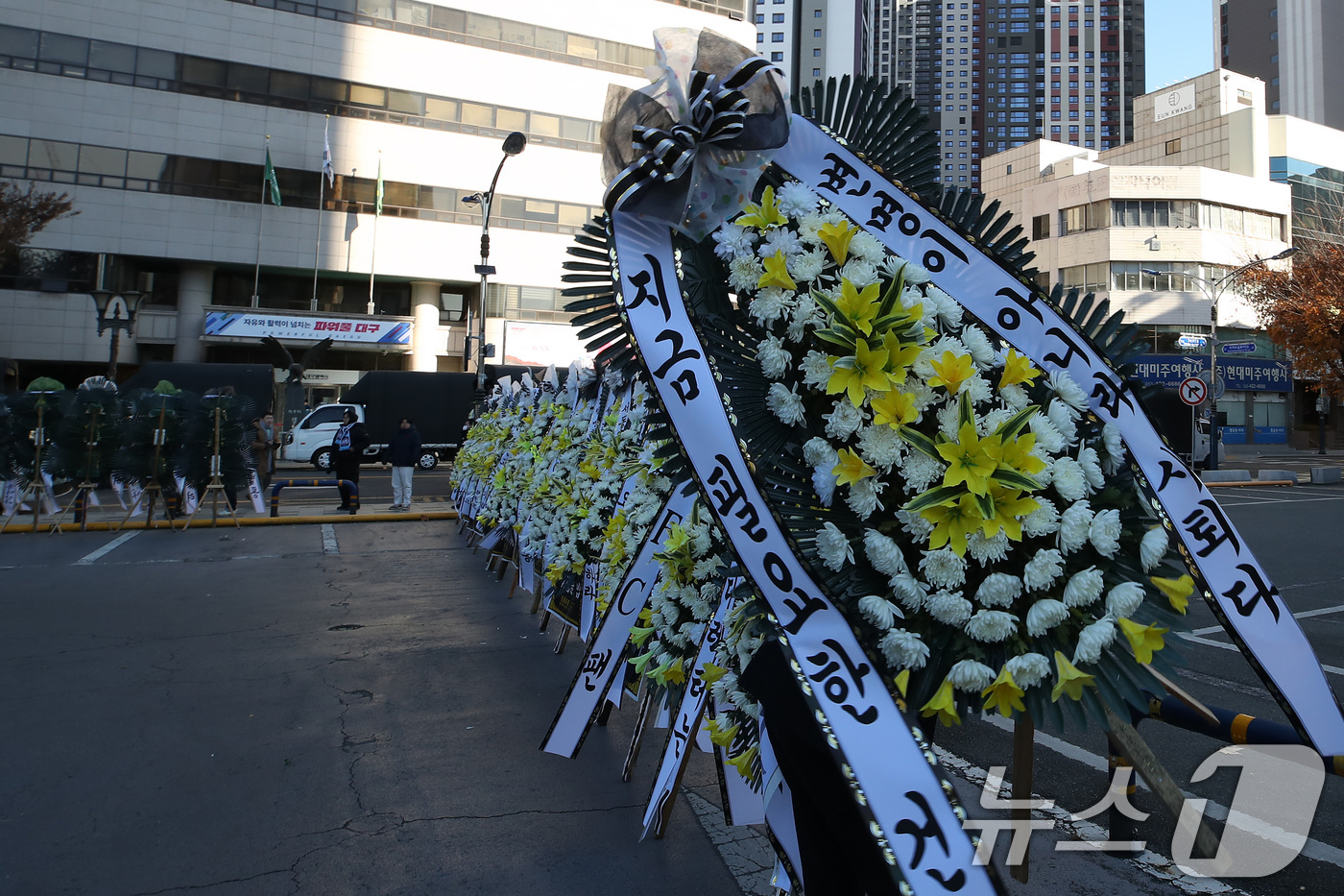 (대구=뉴스1) 공정식 기자 = 대구의 시민 프로축구단 대구FC 응원단(그라지예)과 축구팬들이 5일 오전 대구 중구 동인청사 앞에서 대구FC K리그2 강등에 대한 구단의 쇄신과 대책 마련 등을 요구하는 근조화환 시위를 벌이고 있다. 2025.12.5/뉴스1