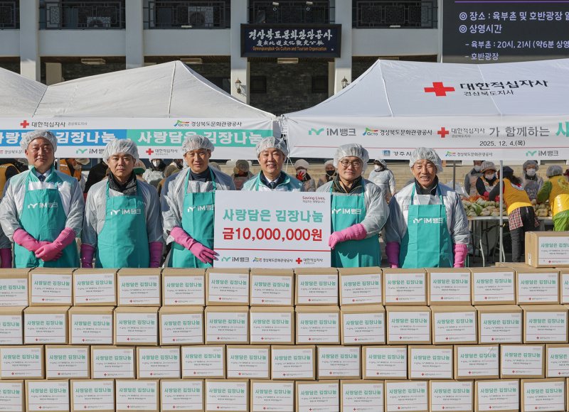 [서울경제TV=오동건 인턴기자] iM뱅크는 지난 4일 경상북도문화관광공사, 대한적십자사 경북지사와 함께 ‘2025년 사랑담은 김장나눔 행사’에 참여해 후원금 전달식을 실시했다고 5일 밝혔다.