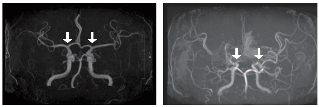 일반인의 뇌혈관(왼쪽)과 모야모야병 환자 뇌혈관(오른쪽). 자료 서울대병원 |