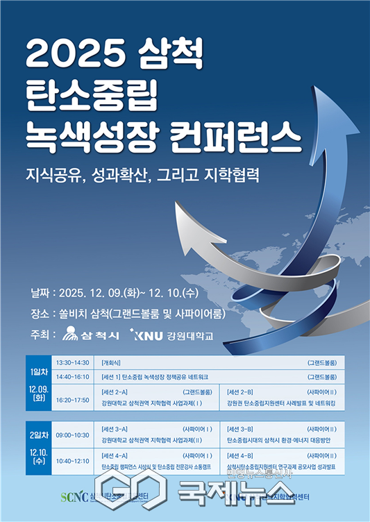 (강원=국제뉴스) 고정화 기자 = 삼척시와 강원대학교는 오는 12월 9~10일 이틀간 쏠비치 삼척에서 '2025 삼척 탄소중립 녹색성장 컨퍼런스'를 공동 개최한다.