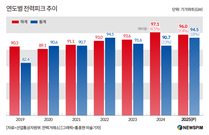 이에 정부는 전력수급대책 역대 최대인 111.5GW의 공급능력을 확보(2024년 110.2GW)했으며, 예비력은 17.0GW(공급예비율 18%) 수준으로 안정적으로 유지할 수 있을 것으로 보고 있다(그래프 참고).