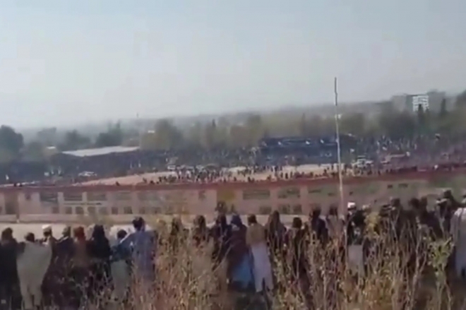 지난 2일 아프간 동부 도시 코스트의 경기장에서 벌어진 공개 처형 현장 모습. 소셜미디어 캡처 |