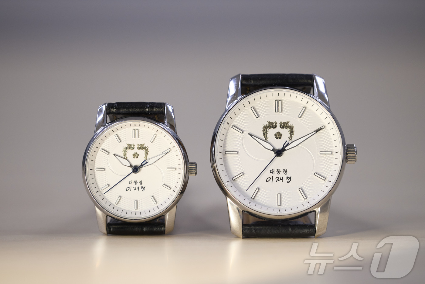 (서울=뉴스1) 이재명 기자 = 대통령실은 5일 서울 용산 대통령실 청사에서 강유정 대변인 브리핑을 통해 이재명 대통령 기념 손목시계를 공개했다. 사진은 왼쪽은 여성용, 오른쪽은 남성용 이 대통령 기념 손목시계. (대통령실 제공. 재판매 및 DB 금지) 2025.12.5/뉴스1