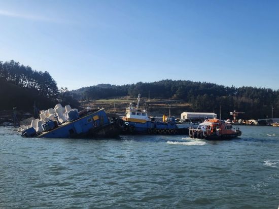 완도군 청산도 도청항 인근 해상에서 테트라포트 800톤을 싣고 항행하던 바지선이 암초와 접촉해 침수되는 사고가 발생했다. 완도해경 제공 |