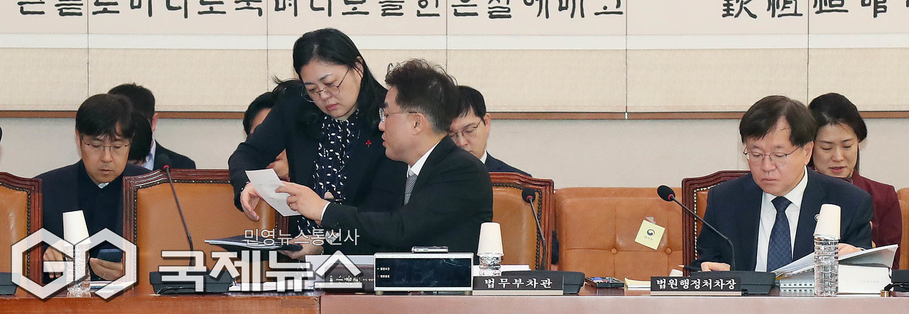 (서울=국제뉴스) 이진수 법무부 차관(왼쪽)이 5일 서울 여의도 국회에서 열린 제429회 국회(정기회) 법제사법위원회 제9차 법안심사제1소위원회에 출석해 회의를 준비하고 있다./사진=이용우 기자