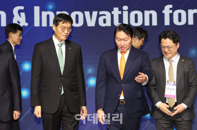 [이데일리 노진환 기자] 5일 서울 남대문로 대한상공회의소에서 제4회 BOK-KCCI 세미나가 ‘AI 기반의 성장과 혁신’을 주제로 열렸다. 최태원(오른쪽 두번째) 대한상공회의소 회장과 이창용 한국은행 총재(왼쪽 두번째)가 기념촬영 후 자리로 향하고 있다.