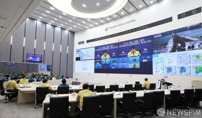 [서울=뉴스핌] 김광용 중앙재난안전대책본부 차장이 5일 서울 종로구 정부세종청사 중앙재난안전상황실에서 ’12.4.~5. 대설 대처 중앙재난안전대책본부 2차 회의’를 주재하고 있다. [사진=행정안전부] 2025.12.05 photo@newspim.com