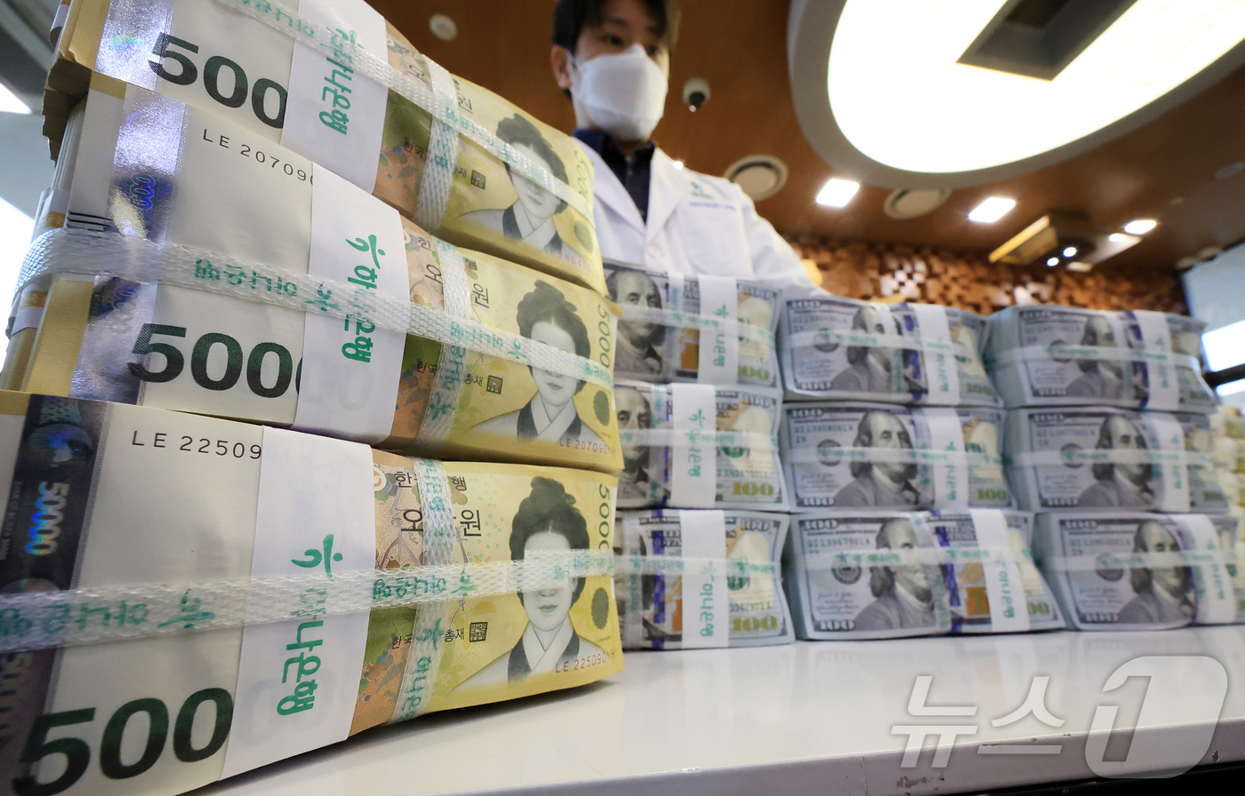 25일 서울 중구 하나은행 위변조대응센터에서 관계자가 원화와 달러화를 정리하는 모습. 2025.11.25/뉴스1 ⓒ News1 김진환 기자 |
