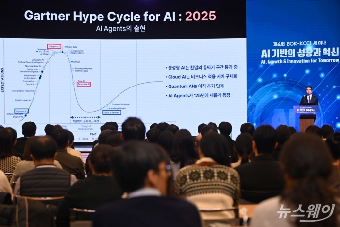 이홍락 LG AI연구원장이 5일 오후 서울 중구 대한상공회의소에서 열린 '제4회 대한상공회의소-한국은행 세미나'에서 'Agentic AI' 주제로로 기조강연을 하고 있다. 사진=강민석 기자 kms@newsway.co.kr |