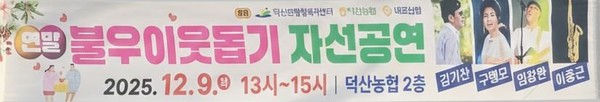 박찬만 덕산면장은 "어려운 이웃을 위해 헌신해 주시는 가수 여러분의 마음에 감사드린다"며 "뜻깊은 자리에 지역민들의 많은 관심과 참여를 부탁드린다"고 당부했다.