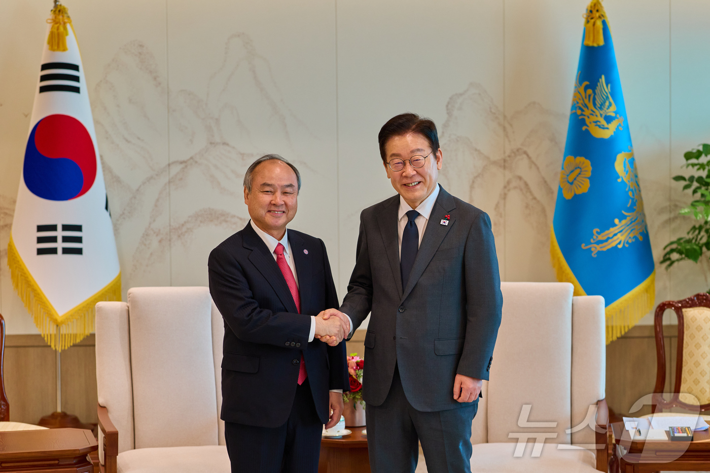 (서울=뉴스1) 이재명 기자 = 이재명 대통령이 5일 서울 용산 대통령실 청사에서 손정의 소프트뱅크그룹 회장 접견에 앞서 악수하고 있다. (대통령실 제공. 재판매 및 DB 금지) 2025.12.5/뉴스1