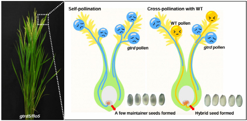 연구팀은 유전자 가위 기술(CRISPR/Cas9)을 활용해 벼 꽃가루의 신장 능력을 약화시켜 자가수분만 선택적으로 억제하는 '부분 웅성불임' 벼를 구현했다. 이는 꽃가루가 정상적으로 성숙하되, 암술 깊숙이 도달하지 못하게 조절함으로써 외부 꽃가루가 교배에서 우위를 점하도록 만든 것이다. 연구팀은 이 과정에서 벼 꽃가루 발아와 신장에 중요한 'GTrD5·GTrD9' 유전자를 활용했다.