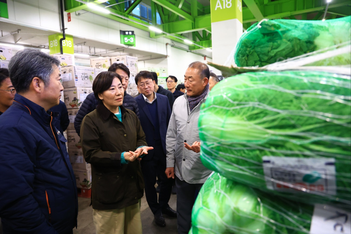 송미령 농림축산식품부 장관이 11월 12일 밤 서울 가락시장을 찾아 배추·무·대파 등 주요 김장채소의 출하 상황과 가격 동향을 점검하고 있다. |