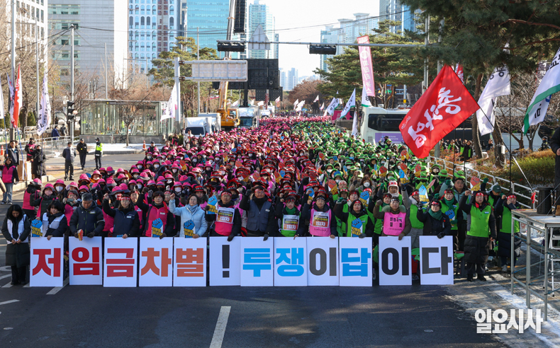 전국학교비정규직노동조합, 전국교육공무직본부, 전국여성노동조합으로 구성된 전국학교비정규직연대회의가 5일 오후 서울 여의도 국회 앞에서 열린 ‘전국학교비정규직연대회의 2차 총파업 대회’에서 구호를 외치고 있다.